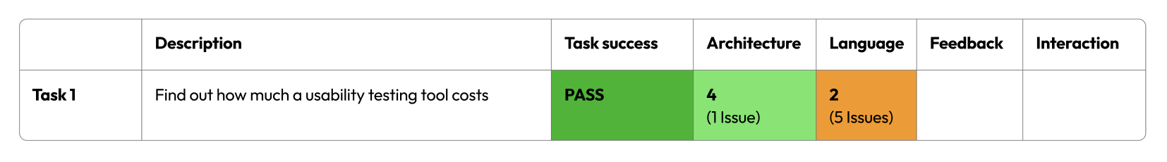 By identifying and counting the number of usability issues in each area, you can assign a clear, trackable score. This provides a baseline score for usability and more importantly, enables teams to monitor progress as changes are made and tested over time.